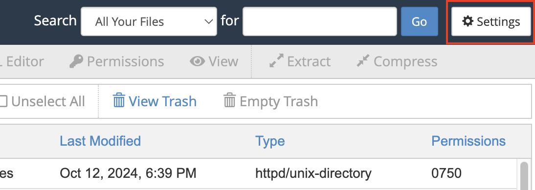 3. If the .htaccess file is not visible in your file manager dashboard, check the ‘Settings‘ located in the upper right corner of the screen. (Skip this step if the .htaccess file is already visible.)
