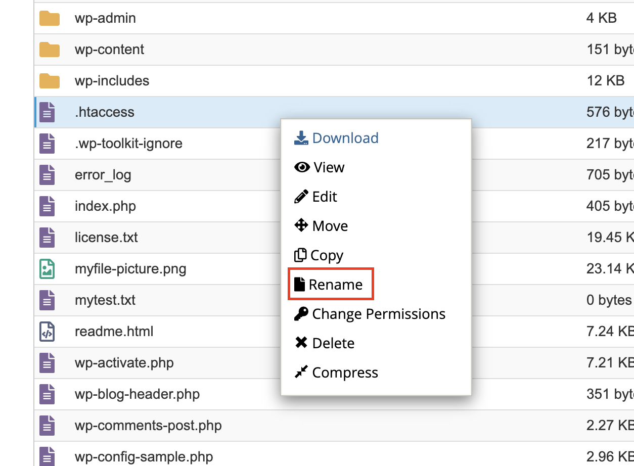 6. You can now rename your .htaccess file to .htaccess2 or any name you prefer.