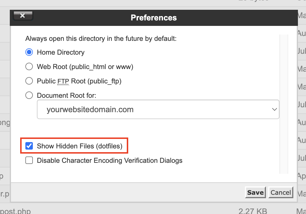4. After clicking ‘Settings,’ a preference pop-up window will appear. Ensure the ‘Show Hidden Files‘ checkbox is checked, then click ‘Save‘. (Skip this step if the .htaccess file is already visible.)