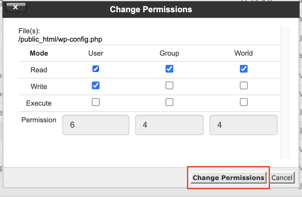 4. If the file permission is not set to 644, you can adjust it by selecting the correct checkboxes as shown in the screenshot. After making the necessary changes, click ‘Change Permissions‘ to save them.