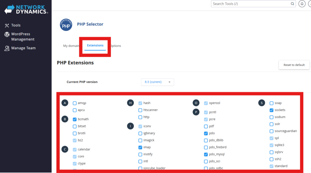 Note: To reset the default extensions for your current PHP version, click “Reset to default”
