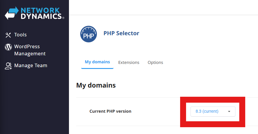 1. Once in the PHP Selector, you will see the “Current PHP version” written near the top of the page under ‘My Domains’. You will see the currently active PHP version in the selection box (e.g. 7.x/8.x).