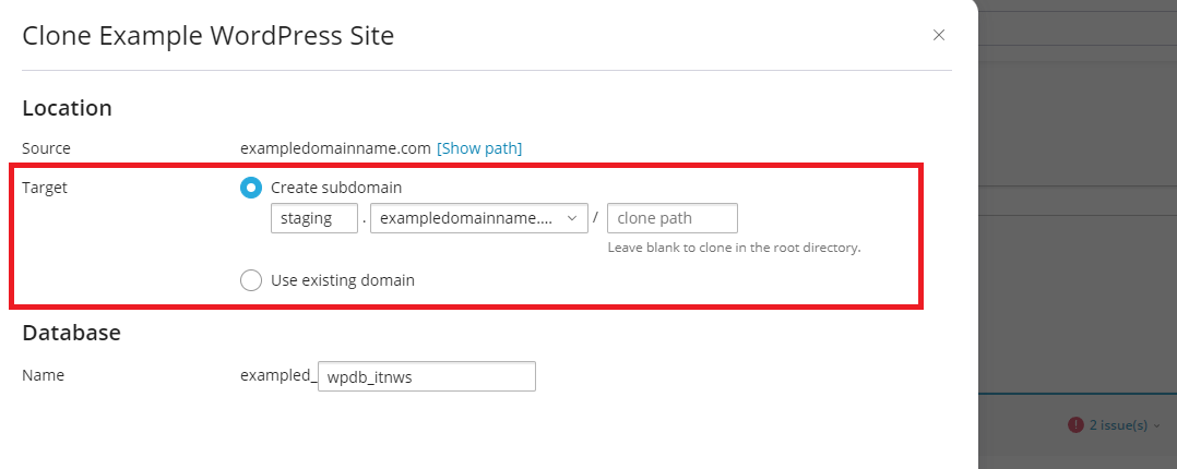 - Select ‘Use existing domain‘ to clone to an existing domain/subdomain. If using an existing domain/subdomain, select it from the drop-down menu.