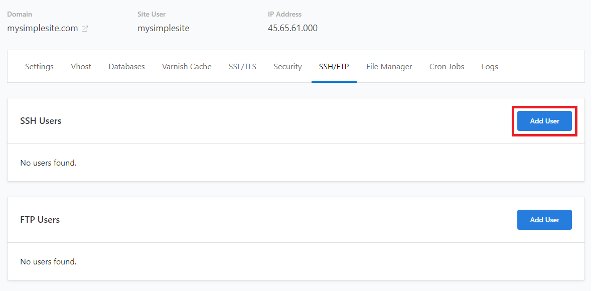 5. Then click on ‘Add User‘ in the “SSH Users” section
