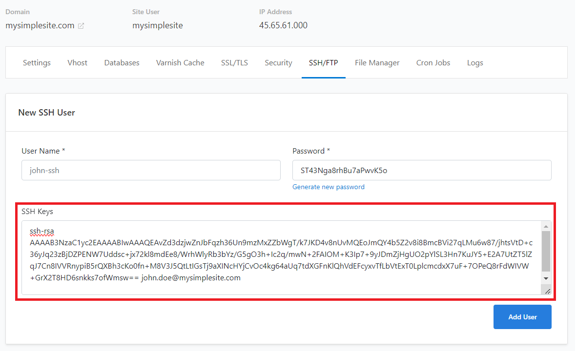 8. Click ‘Add User‘ when you’re done to save the SSH user details.