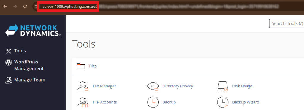 - https://server-XXX.wphosting.com.au or https://server-XXX.networkdynamics.com