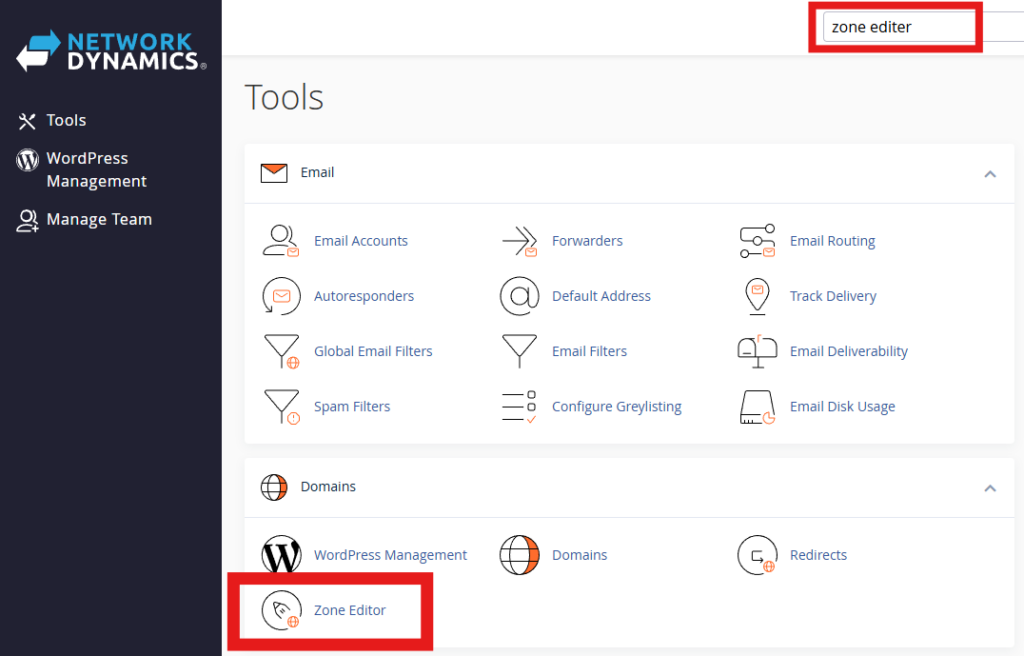 2. Navigate to the “Zone Editor” tool located under the Domains sub-menu (you can also search by keyword via the search bar in the top-right corner).