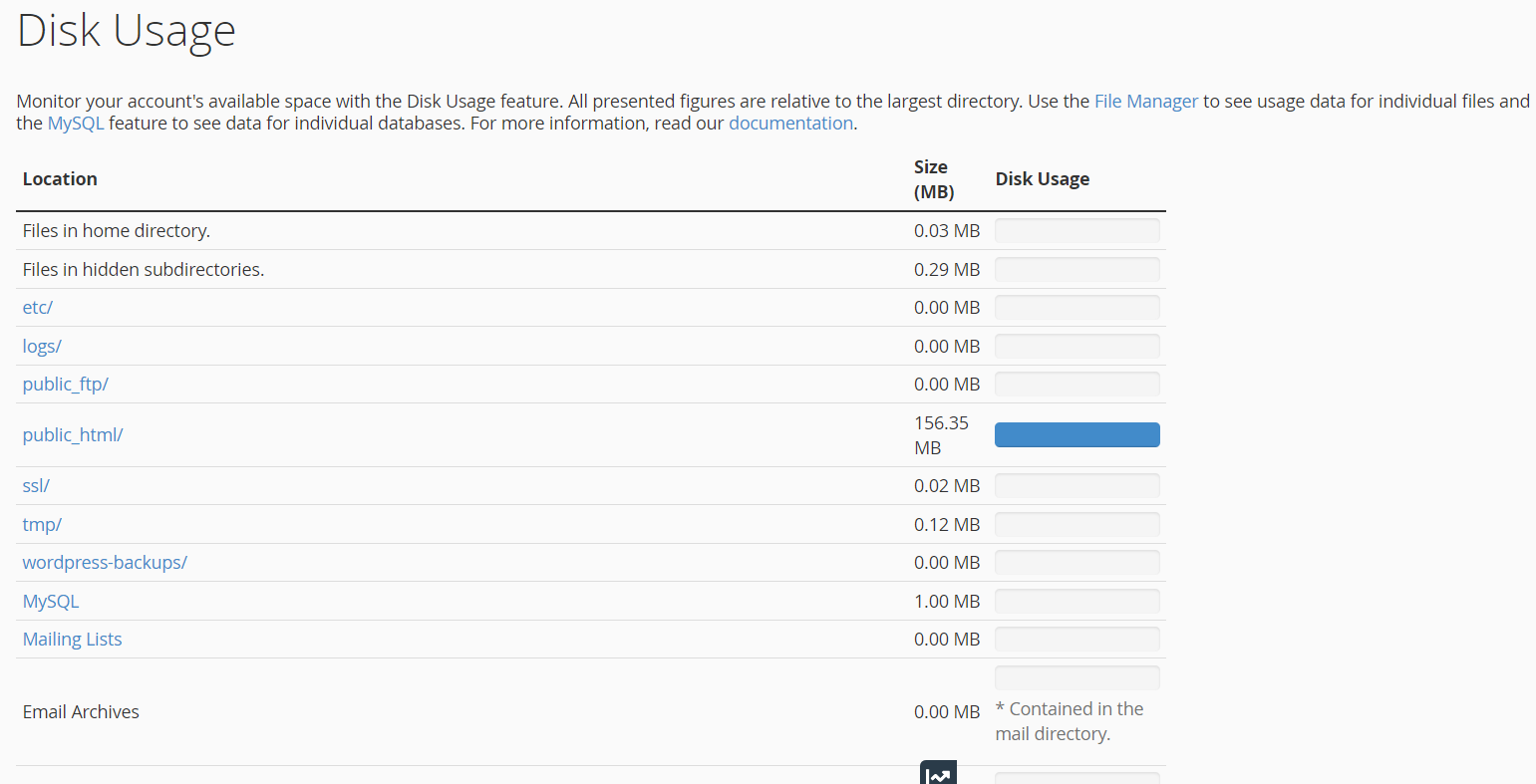 The Disk Usage tool in cPanel provides valuable insights into your website’s storage consumption. It helps you manage your storage space more efficiently.