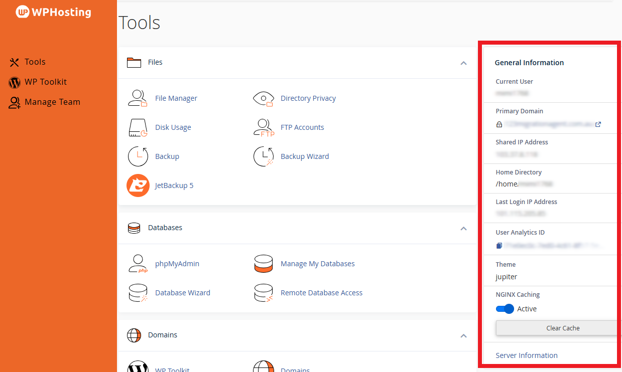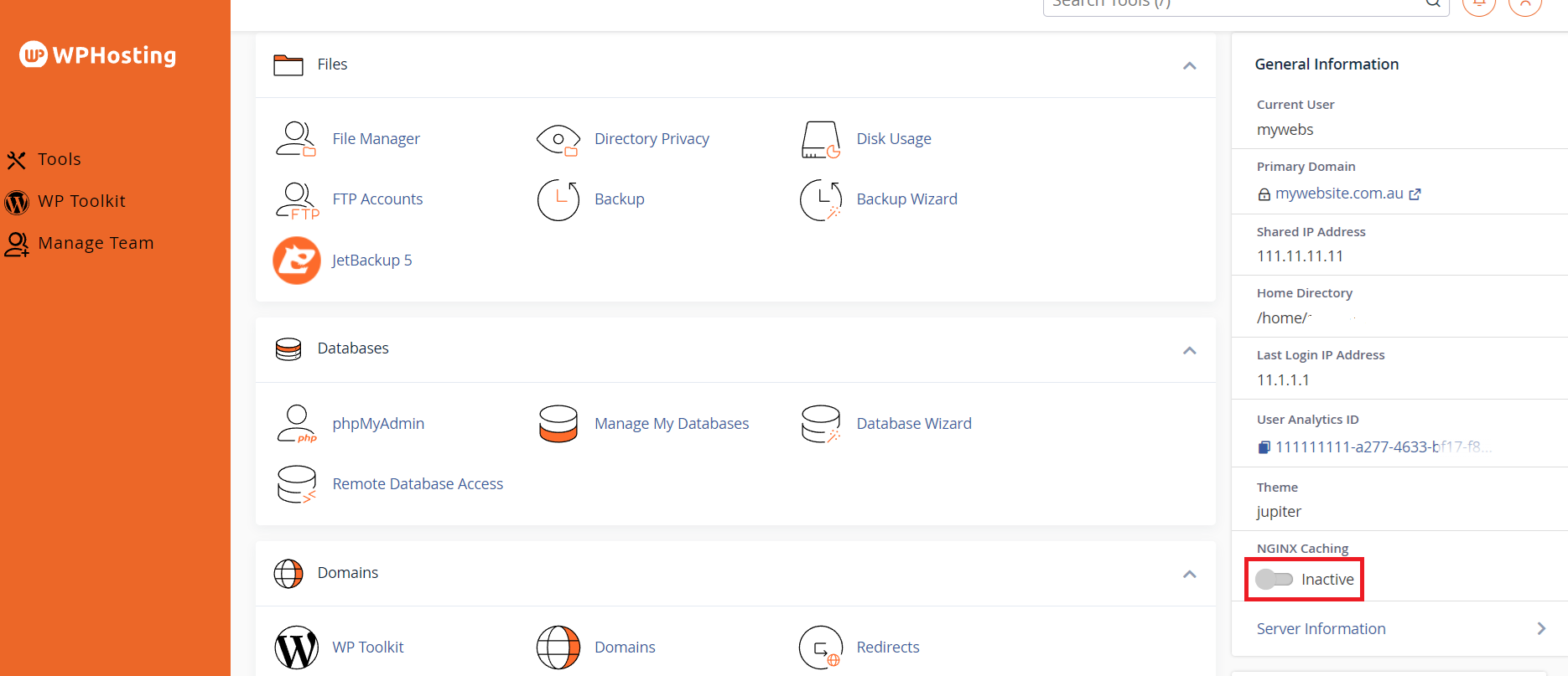 2. Look for the ‘NGINX Caching’ section in the ‘General Information‘ panel on the left. Then click the toggle switch labelled ‘Inactive‘ to enable caching.
