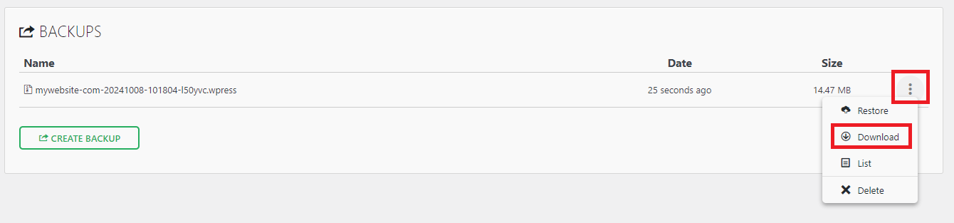 9. You will now see the list of backups you just created. Click the ‘More Options‘ button (three vertical dots) and select ‘Download‘ to start downloading your AIO backup.