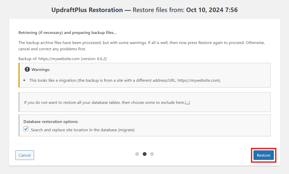7. If you’re restoring or cloning your site to a different domain, a notice will appear. However, if you’re restoring it to the same domain, this notice will not be shown. The source domain of your backup will also be displayed, and the ‘Search and Replace‘ checkbox for the database restoration process will be checked by default. Simply click ‘Restore‘ to proceed to the next step.