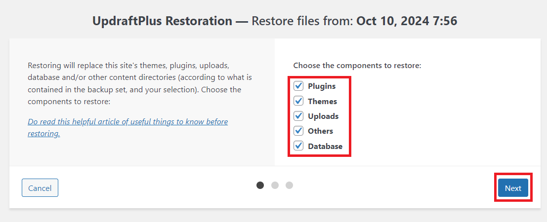 6. After that, the restoration wizard will appear. Then, select all the components by checking each box one by one. Once you’ve selected everything, click the ‘Next‘ button.