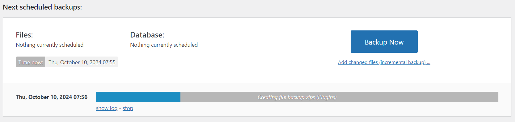 8. A loading bar will appear in the ‘Next scheduled backups‘ section, just below the ‘Backup Now‘ button. Please do not refresh or click anything until the backup process is complete.