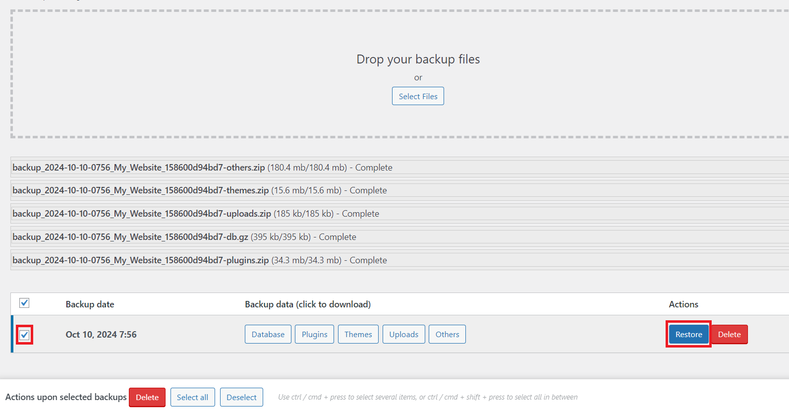 5. Then, once the backup files are successfully uploaded, the backup details will appear. After that, check the box next to the date and click the ‘Restore‘ button to begin the restoration process.