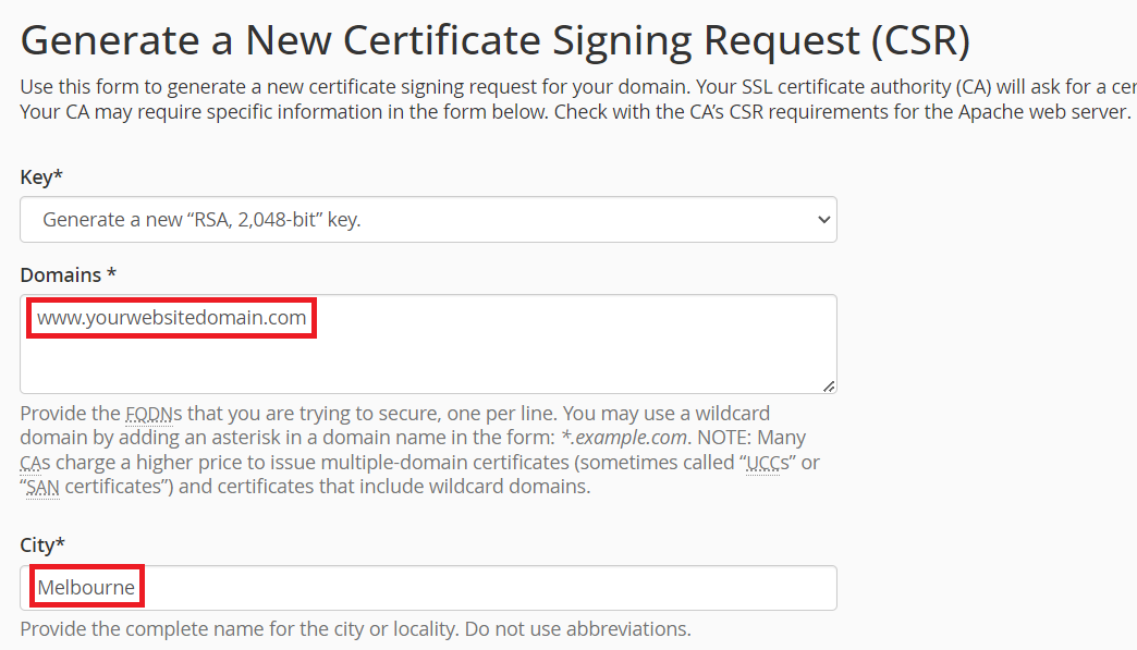 IMPORTANT NOTE: The SSL certificate will be bound to the domain name that you enter in this field. The ‘www.’ sub-domain is the only exception. A standard SSL covers both the root domain and the ‘www.’ subdomain (for example, example.com and www.example.com).