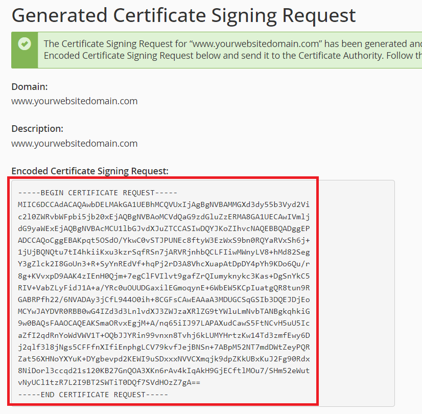 6. After you finish, you’ll receive a confirmation message that your CSR is complete. The CSR then appears on the screen for you to use with your certificate provider.