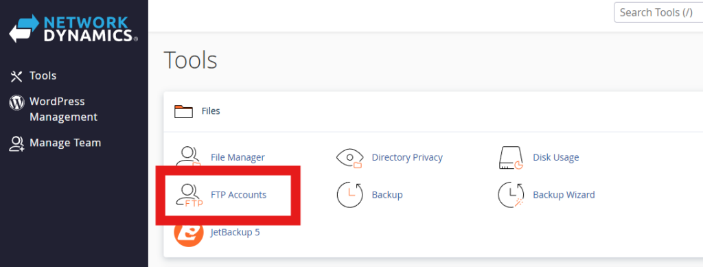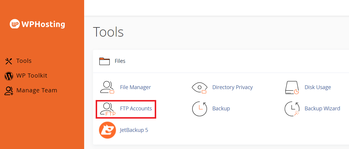 2. Navigate to ‘FTP Accounts‘, located in the “Files” section of the cPanel Tools