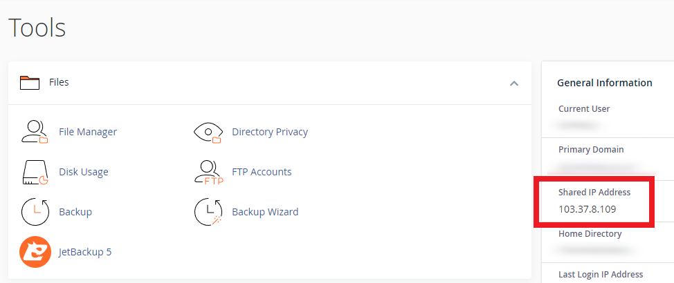 PLEASE NOTE: If your domain’s DNS records do not point to Network Dynamics servers, then you may need to connect using the IP address instead of the hostname/server name. You can find the server’s IP address listed on the main page of your cPanel service under ‘General Information‘, shown below.