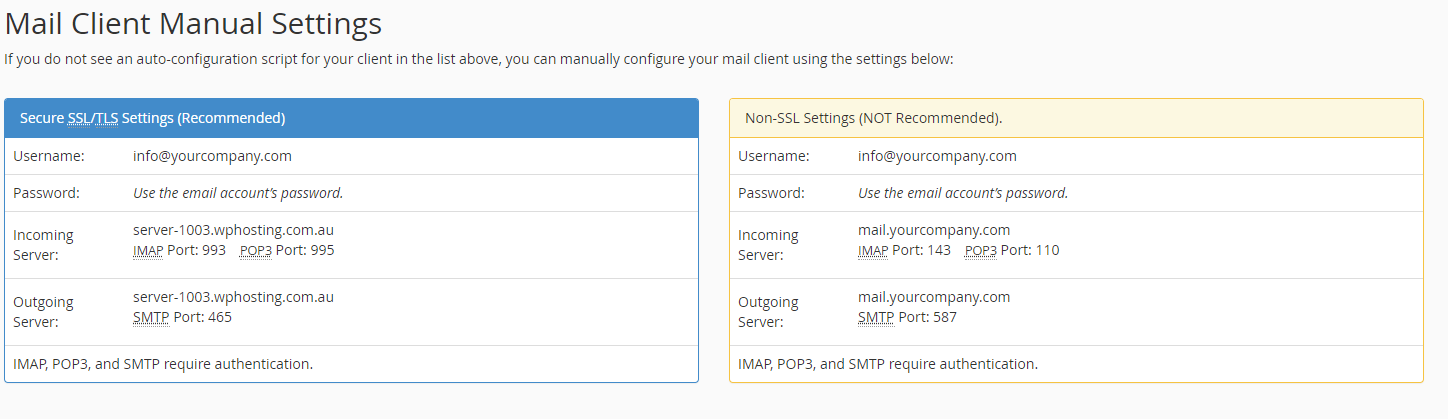 If you need to configure an account manually, you can find your mail configuration settings within cPanel under Email Accounts > Connect Devices