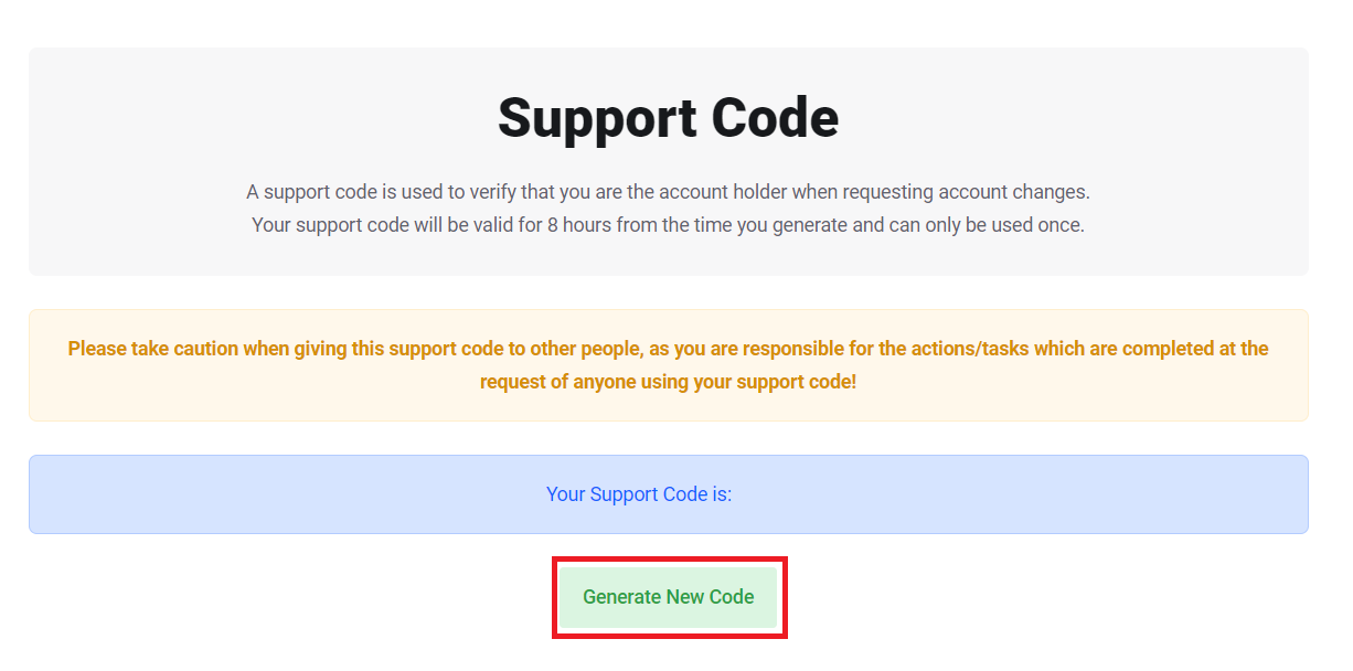 Note: The support code acts as an additional layer of security, providing users with a unique identifier to authenticate their accounts. This helps verify their identity and enhances overall account security measures.