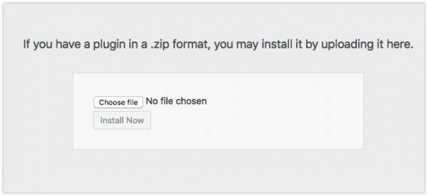 4. Click the ‘Upload Plugin‘ button in the top left area, then click the ‘Choose file‘ button. Navigate to the zip file that you downloaded earlier in Step 1, and then click ‘Install Now‘.