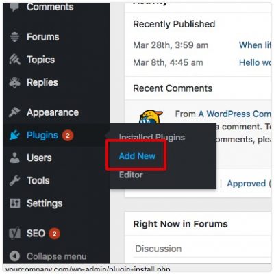 3. After logging in, on the dashboard find the “Plugins” option in the side menu then click “Add New“.