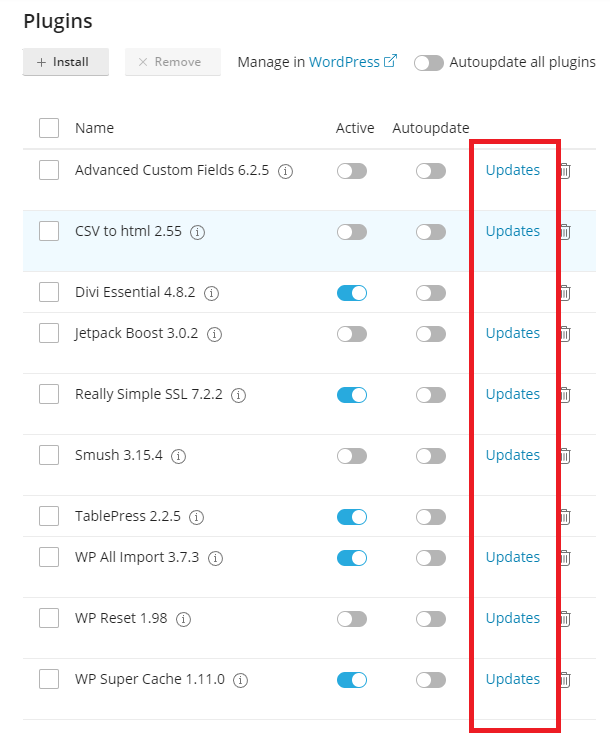 2. You will then see a list of plugins installed for this instance of WordPress. If a plugin is reported to have a newer version, “Updates” will appear next to the plugins/themes with available updates.