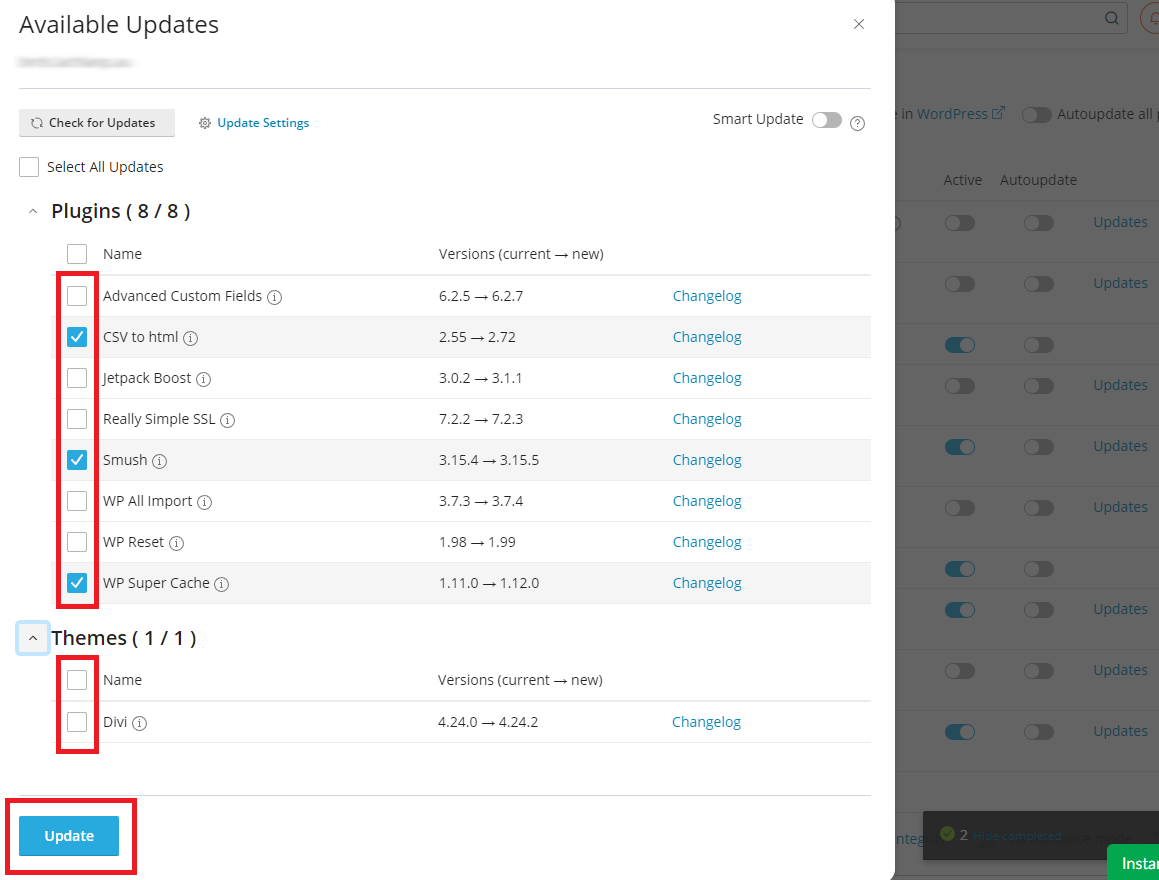 4. After that, click the checkbox next to each of the plugins/themes you’d like to update. (Placing a tick in the top checkbox, next to ‘Name’, will select all available items)
