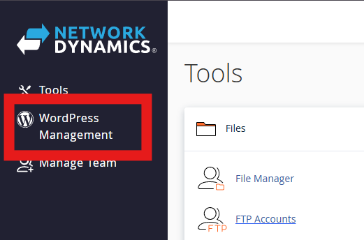You can access the WordPress Management tool from the vertical menu on the left-hand side of the cPanel interface. Alternatively, you can find it in the list of tools under the “Domains” section.