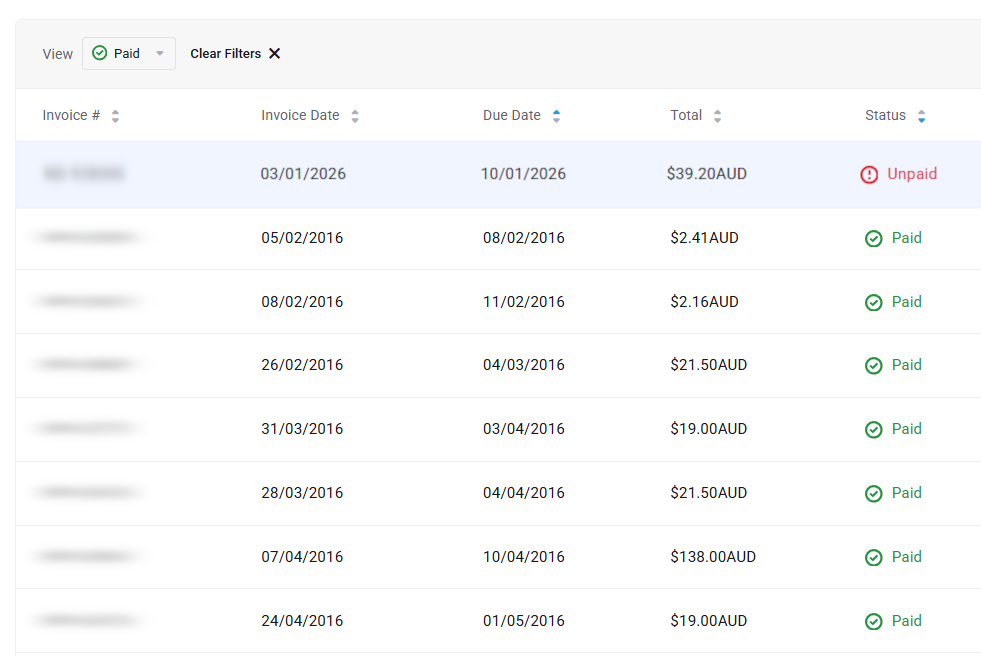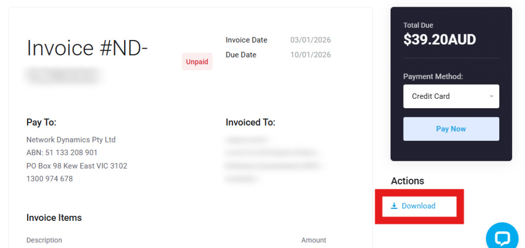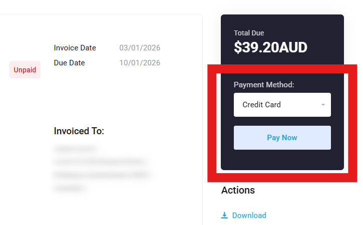 You can also download invoices as a PDF by selecting an invoice and then clicking ‘Download‘ listed under the ‘Actions’ sub-heading below the ‘Pay Now’ button.