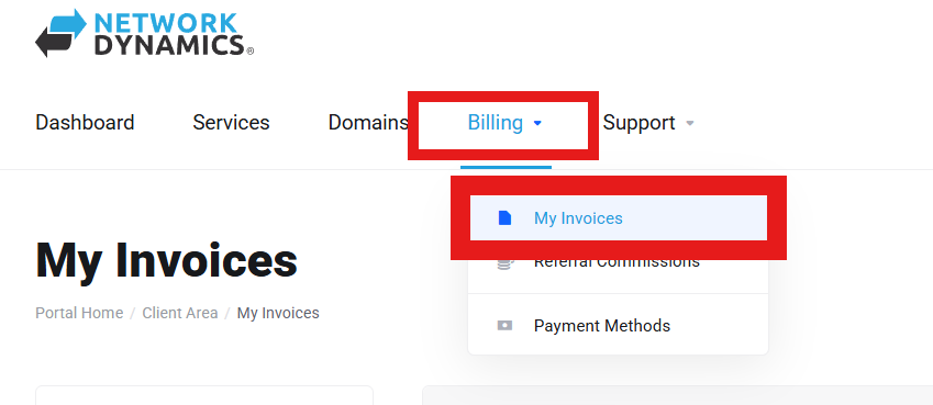 2. Click on the ‘Billing‘ menu, then select ‘My Invoices‘ from the drop-down menu.