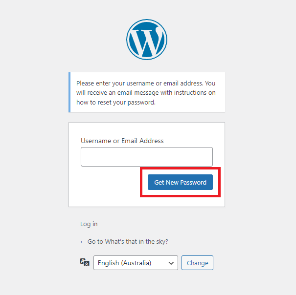 3. On the next screen, enter your email address or username of your admin account and click ‘Get New Password‘. A password reset email will be sent to that address or the one associated with the username entered, with further instructions to change the password.