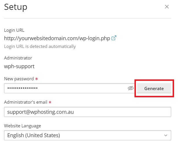 6. Click ‘Generate‘ to create a strong, random password. Alternatively, type your own password into the ‘New Password’ text box.