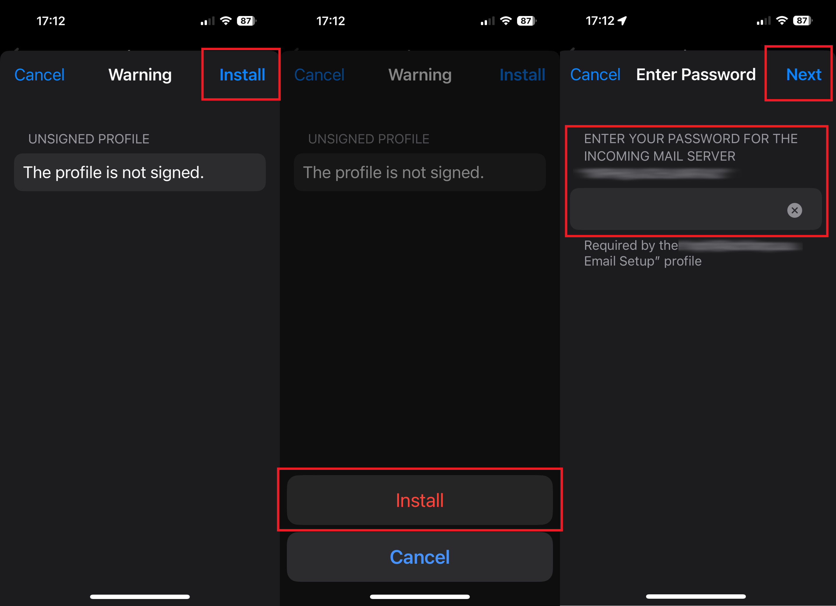 (if you’ve forgotten the password, you can reset it using the steps in this guide: How to Update Email Password via cPanel). - After you’ve entered the correct password, tap ‘Next‘.