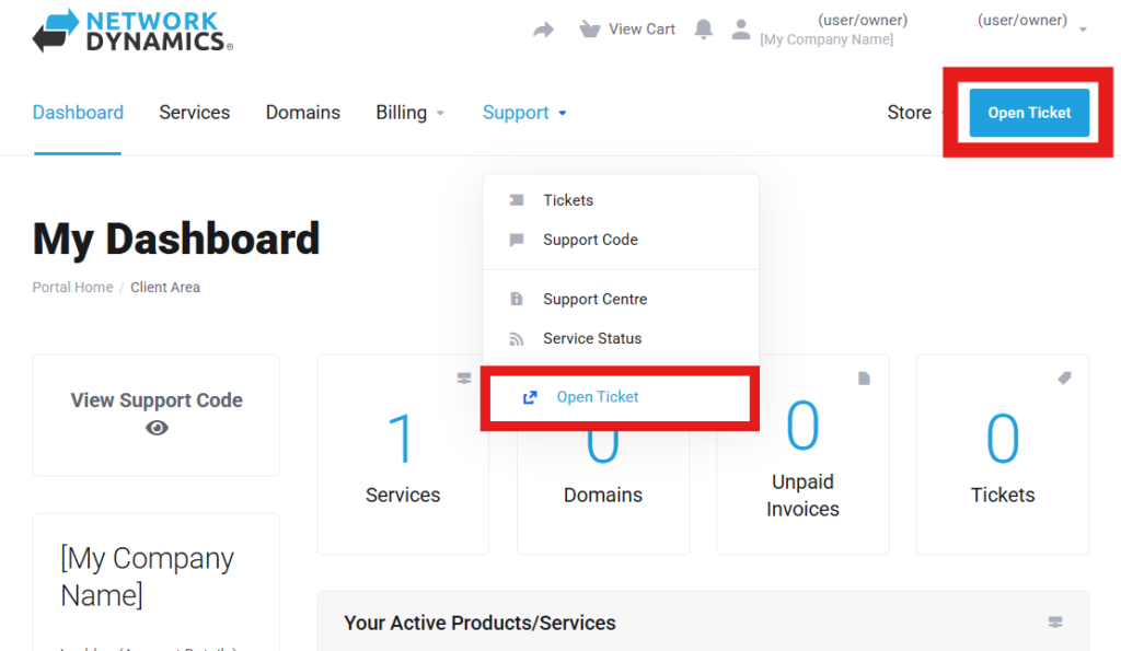 2. From any page in the Client Area, you will see an ‘Open Ticket‘ button in the top right (you’ll also find a link to open a ticket from the ‘Support’ drop-down menu)