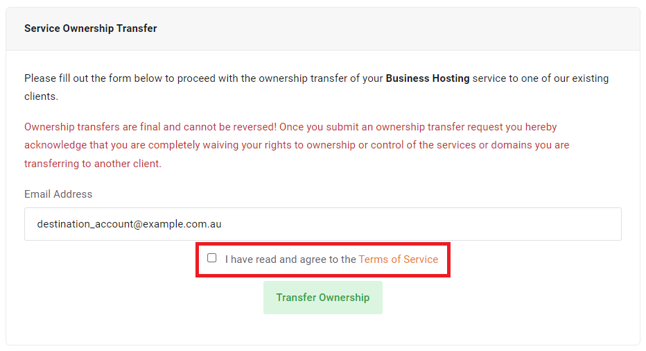 5. Finally, enter the email address of the Network Dynamics account that will be the recipient of the service you’re transferring (this should be the email address listed in the “Account Details” section of the recipient’s Network Dynamics Client Area)