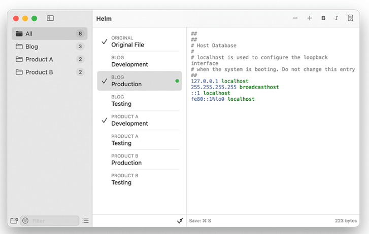 Helm is a local host file editing tool for macOS. Rather than having to use the terminal to elevate your privileges and then use a text editor to make the changes, Helm allows for rapid editing of your host file from within the GUI.